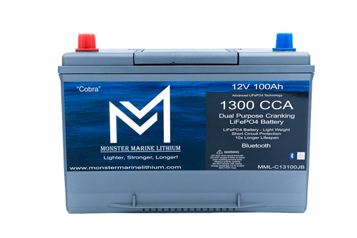 Monster Marine Lithium⚡ Monster Marine Lithium™ “Cobra” 1300CCA • 100Ah Dual Purpose Bluetooth Cranking Lithium Battery Model: MML-C12V13JB Overview Introducing The Co...