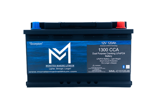 Monster Marine Lithium⚡ Monster Marine Lithium™ “Scorpion” 1300CCA • 120Ah Dual Purpose Bluetooth Cranking Lithium Battery Model: MML-13C120JB Overview Meet The Scorpi...