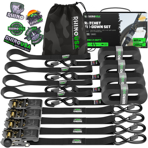 Rhino USA, Inc.FREE STICKER PACK INCLUDED! ($9.97 VALUE) RATCHET STRAPS (4PK) - 1,823lb Guaranteed Max Break Strength, Includes (4) Premium 1in x 15ft Rachet T...