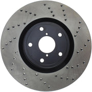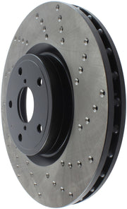 StopTech Drilled Sport Rotors are 1-piece direct replacement brake discs for factory brake systems and stock calipers that look great behind your wheels – and offer significantly improved braking performance. The unique cross-drilling aids with heat and brake dust dispersal; prevents glazing of the pads; adds bite and improves wet and dry braking performance. Built to last; the black e-coating provides protection from corrosion and the high carbon metallurgy (in most applications) offers quieter operation; better crack resistance and increased performance.