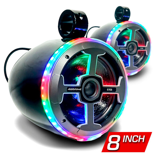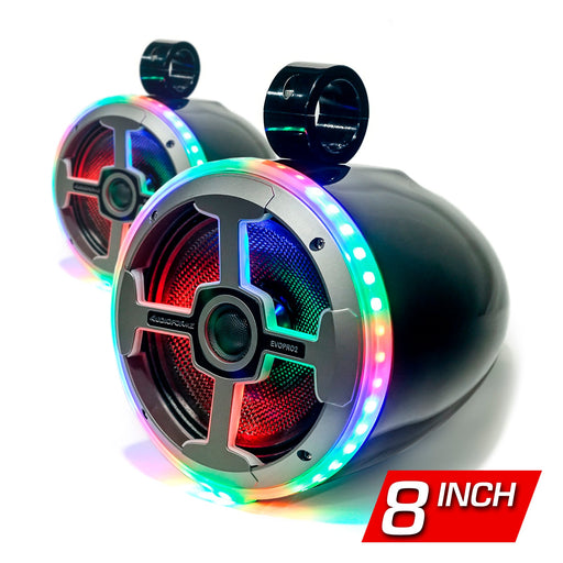 EVO2 8in 2-Way Component Marine IC LED Tower Speakers Clamp Fits Tube Size: 1.75in - 2.0in  Black High Gloss Gelcoat Finish Available with or with...