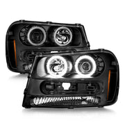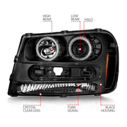 Phares de projecteur ANZO 02-09 Chevrolet Trailblazer (ne conviennent pas aux 06-09 LT) avec boîtier noir Halo