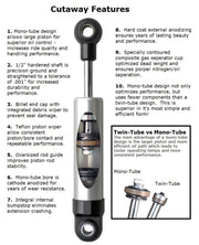 Amortisseur avant HQ avec course de 4,75" avec montage œil/œil. Comprend 1 amortisseur réglable en rebond avec manchons de 1/2" et 5/8" ID (1,688" de large). 10,15" x 14,9" avec une hauteur de caisse de 12,5"-13".