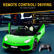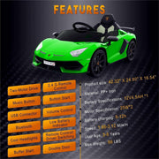 The 12V Electric Battery Powered Sports Car for Kids with Remote Control - Green is the ultimate ride-on car for your little ones. Let their imagination run wild as they cruise around in this officially licensed Lamborghini. With LED headlights, horn and engine sounds, and hydraulic powered doors that swing open just like the real thing, this remote control ride on car is sure to bring endless fun and excitement. But that's not all, this car also comes with two driving modes. Parents can take control with the remote control feature, allowing them to steer and control the car's speed (with 3 speeds shifting) if their child is too young to operate it themselves. Alternatively, kids can operate the car on their own using the foot pedal and steering wheel (with 2 speeds shifting), giving them a sense of independence and freedom. Get ready for a cool and thrilling ride with the 12V Electric Battery Powered Sports Car. Equipped with two powerful 25W motors and a 12V rechargeable battery, this car delivers premium performance. Your kids can enjoy up to 1-2 hours of safe and exciting ride, with speeds ranging from 1.86 to 3.12 mph. The car also features brilliant LED front and rear lights, adding to the overall cool factor. But it doesn't stop there. This ride-on car is packed with additional features that will enhance your little one's experience. It has built-in music and stories, Bluetooth, AUX cord, TF port, and USB port, allowing your kids to play their favorite tunes while cruising around. The car is made of safe materials and is certified with ASTM and CPSIA, ensuring your child's safety. The 12V Electric Battery Powered Sports Car for Kids with Remote Control - Green is not just a toy, it's a gift that will enrich your child's life and enhance the parent-child relationship. Whether it's for Christmas or a birthday, this ride-on car is the perfect present for your children or grandchildren. Key Features: Officially licensed Lamborghini ride-on car LED headlights, horn, and engine sounds Hydraulic powered doors that swing open Parental remote control and kid's manual operation Built-in music and stories Bluetooth, AUX cord, TF port, and USB port Brilliant LED front and rear lights Two powerful 25W motors 12V rechargeable battery Speeds ranging from 1.86 to 3.12 mph Made of safe materials Certified with ASTM and CPSIA Product Specifications: Brand: Hetoy Material: Iron Item Weight: 66 Pounds Item Dimensions LxWxH: 42 x 25 x 16 inches Theme: Ride on Car Assembly Required: Yes Color: Green Manufacturer recommended age: 3 years and up
