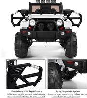 The 12V Electric Jeep Ride-On Car with Parental Remote Control and MP3 Player for Kids is the ultimate ride-on toy for adventurous children. With its attractive and fun features, this electric car provides hours of entertainment and excitement. It comes in a sleek white color, adding to its cool and realistic appearance. This remote control ride on car offers two modes of operation. In the parental remote control mode, parents can control the car using the remote control, allowing them to enjoy the ride-on experience with their child. In the battery-operated mode, children can use the foot pedal and steering wheel to operate the car themselves, promoting their independence and coordination. The car is equipped with an MP3 player, AUX input, USB port, and TF card slot, allowing you to connect your device and play your child's favorite music or stories. This brings an extra surprise to your baby and enhances their enjoyment during play. Safety is a top priority with this ride-on car. It features a soft start function, which provides gradual acceleration and reliable braking, preventing children from being frightened by sudden movements. The car also has four wear-resistant wheels made of superior PP materials, eliminating the hassle of inflating tires and ensuring a safer and smoother driving experience. The ride-on car has a cool truck-like appearance, with bright front and rear LED lights and double doors with a magnetic lock. It also has a spacious and comfortable seat with a multi-point safety belt, allowing your child to sit and play comfortably. The spring suspension system ensures a super smooth ride, even on uneven surfaces. This scientifically designed ride-on car is the perfect gift for your child's birthday or Christmas. It not only provides entertainment but also helps enhance your child's independence and coordination. The car has an overall dimension of 46.5"Ă—31"Ă—29" (LĂ—WĂ—H) and is recommended for children aged 3-7 years old. Key Features: Two modes of operation: parental remote control mode and battery-operated mode Forward and reverse functions with three speeds on the remote control MP3 player, AUX input, USB port, and TF card slot for playing music or stories Soft start function for gradual acceleration and reliable braking Bright front and rear LED lights Double doors with magnetic lock Comfortable seat with multi-point safety belt Wear-resistant and explosion-proof PP wheels Spring suspension system for a super smooth ride Product Specifications: Color: White Main Material: PP + Iron Overall Dimension: 46.5"Ă—31"Ă—29" Net Weight: 45 lbs Weight Capacity: 66 lbs Speed: 3-6 KM/H Battery: 12V 7AHĂ—1 Get ready for hours of fun and adventure with the 12V Electric Jeep Ride-On Car with Parental Remote Control and MP3 Player for Kids. Order yours today and watch your child's imagination soar!