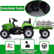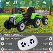The 12V Electric Kids Ride On Tractor with Trailer - Battery Powered Car Toy for Christmas is the perfect gift for your little one. This realistic ride-on tractor will give them a thrilling and authentic driving experience. With the push of a button, they can drive forward at two different speeds and even steer in reverse. The tractor features 7 LED headlights, a foot pedal, a horn, a solid armrest, and a shift knob, all of which add to the excitement of the ride.But the fun doesn't stop there. This rc ride on car also comes with built-in horn and audio features. Your child can enjoy preset sounds and cool horn sounds, or connect their phone or USB card to play their favorite music or stories. The volume is adjustable, ensuring a personalized and enjoyable experience. With a high-quality 12V 4.5AH battery, the tractor can run for 40-50 minutes on a full charge.Safety is a top priority with this ride-on tractor. It is designed with an adjustable safety belt and armrests, providing a secure and comfortable driving experience. Additionally, it comes with a parent remote control, allowing you to ride along with your child and ensure their safety. Of course, your child can also drive the tractor themselves using the foot pedal and steering wheel.One of the standout features of this ride-on tractor is the large detachable trailer. Your child can use it to transport toys, tools, garden supplies, flowers, straw, and even snacks in the backyard or garden. It adds an extra level of fun and adventure to their playtime. Just remember, the trailer is not meant for transporting people.This ride-on tractor is built for high performance. It is equipped with a large high-quality 12V rechargeable battery and two powerful 25W motors. The wear-resistant and non-slip wheels ensure a smooth and fast ride, even on complex terrains like dirt, grass, and gravel roads. The maximum load capacity is 66lbs, and the speed can reach up to 2-5mph.Specifications:- Color: Green- Material: PP+Iron- Weight: 34lbs- Weight Capacity: 66lbs/30kg- Over dimensions: 54 x 20 x 21 inches- Battery: 12V 4.5AH*1- Motor: 25W X 2- Charging Time: 8-12 hours- Using Time: 30-40 minutes- Speed: 3 speed (2-5 mph)- Suitable for ages 3+- Theme: Cars- Recommended Age Range: 3-8 years- Year: 2023- Character Family: CarThe 12V Electric Kids Ride On Tractor with Trailer - Battery Powered Car Toy for Christmas is a must-have for any young adventurer. Get ready for hours of fun and excitement as your child explores the world in their very own ride-on tractor.