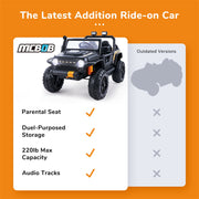 The 12V Electric Ride-On Car for Kids with Remote Control - Perfect for Parent-Child Bonding! is the ultimate ride-on toy for your little ones. With its 2-seater design, this car allows two 2-3 year old kids or one kid plus an adult to ride on, making it perfect for family adventures. The car is equipped with a 12V 10AH removable battery, providing a long-lasting and thrilling riding experience. Get ready for a realistic and exciting ride with this car. Start the car by clicking the green button or inserting the car keys, giving your child a sense of independence and control. The car features shock absorption wheels, ensuring a smooth and comfortable ride on various types of roads. Safety is a top priority with this ride-on car, as it comes with a three-point safety belt and two lockable doors, ensuring the utmost protection for your child. Not only is this car fun to ride, but it also offers additional features to enhance the overall experience. The car comes with onboard music, headlights, FM radio, and Bluetooth connectivity, allowing your child to jam out to their favorite tunes while cruising around. The USB/Bluetooth function makes it easy for children to switch between songs with the touch of a button. Designed with both functionality and convenience in mind, this ride-on car also doubles as a storage box. The spacious storage box can also be used as a parent seat, allowing you to join in on the fun and create unforgettable memories with your kids. Specifications: Brand: Klökick Max Weight Capacity: 220lbs Color: Black Material: Eco-Friendly PP, Metal Speed: 3-5 mph Charge Time: 8-12 Hours Run Time: 2 Hours Battery Type: 12V 10AH Charger: 12V/35W Remote Control: Yes Recommended Age Range: 1-8 Years Product Size: 48.6*27.6*28 inch Get ready to embark on thrilling adventures with the 12V Electric Ride-On Car for Kids with Remote Control. Order yours today and watch your child's face light up with joy!