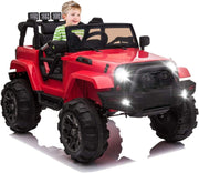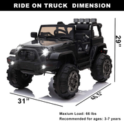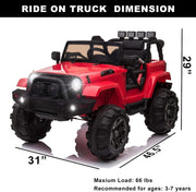 Product Description The 12V Electric Ride-On Truck for Kids with Parental Remote Control Choose the electric car as a great companion to accompany your child’s growth, let your little kids live out his or her dreams aboard this 12V motorized truck, provide your children with the most authentic driving experience, enhance your child's independence and coordination in play and joy. Color: Red Main Material: PP + Iron Dimension: 46.5"×31"×29" Net Weight: 45 lbs Weight Capacity: 66 lbs Applicable age: 3-7 years old Speed: 3-6 KM/H Battery: 12V 7AH×1 Charge Time: 8-12 hours Key Features: Suspension Wheels design for smooth driving---Perfect for indoor or outdoor playing. Forward & reverse functions, 3 speeds on remote control for adjustment. (Speed: 3-6 KM/H) Soft start function for gradual acceleration and reliable braking. Double door with magnetic lock, bright front& rear LED lights Antiskid & Durable Wheels - Features wear-resistant wheels,which made of superior PP materials with no possibility of leaking or tire burst, eliminating the hassle of inflating. Comfortable Seat - Large capacity allows kids free movement and comfort. Adjustable seat belt keeps kids safe during driving. Music Play Fun - Equipped with MP3 player, AUX input, USB port & TF card slot, and it also can be connected to your device to play music or stories, provide your children with real experience and enjoy their favourite music anytime. Portable Handle - When battery runs out, you can pull out the handle and move the car easily. Foot Pedal & Shift Lever - The foot pedal on the floor and shift lever help children to drive on their own when they are in manual mode. Naturally develop their hand-eye coordination ability in play and laughter. Specifications: Dimension: 46.5"×31"×29" (L×W×H) Weight Capacity: 66 lbs Battery: 12V Speed: 3-6 km/h Remote Control: ? Suitable Age: 3-7