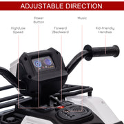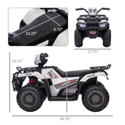 The 12V Kids ATV with Music, Headlights, and Forward/Backward Function - A Fun Ride for Young Adventurers!Introducing the Aosom 12V Kids ATV, a thrilling and exhilarating ride-on toy that will make your child the center of attention. This electric ATV is designed for young adventurers who crave excitement and want to explore the great outdoors in style. With its realistic features, including three LED headlights and music, your child will feel like they're driving a real car or truck as they cruise through the neighborhood.Key Features:- Features three LED headlights and music to provide a realistic riding experience- Textured wheels for improved traction- Connect a device with the MP3 port and USB port to play your child's favorite tunes- Full charge lasts 50 minutes of play- Two-speed setting, 1.2-2.5 mph- Comfortable seat and handles to hold on to- Easy to assemble with clear instructionsSpecifications:- Material: PP, Steel- Overall Dimension: 34.75" L x 17.75" W x 19.75" H- Seat Size: 14.25" W x 6.75" D x 13.5" H (off the ground)- Wheel Size: ?9.5"- Charging Time: First charging: 8 hours, regular charging: 8-12 hours- Use Time: 50 mins (depending on intensity of use)- Battery: 12V, 4.5AH. Motor: 12V x 2- Speed: 1.2-2.5 mph- Recommended Ages: 3-5 years old. Certification Age: 3-6 years old- Weight Capacity: 55lbs- Certification: ASTM F963, CPSIAThe Aosom 12V Kids ATV is built with safety in mind. The big, wide wheels provide stability and improved traction, ensuring a safe ride for your child. The headlights are not only a cool feature but also serve as a safety measure, especially when riding during dusk or in low-light conditions. This way, your child can be easily seen by pedestrians and other vehicles.Made from high-quality PP and steel, this ride-on toy is built to last. Its sturdy construction can withstand the adventures and rough play of young children. The comfortable seat and handles provide a secure and enjoyable riding experience, allowing your child to have hours of fun.This electric ATV is perfect for children aged 3-5 years old, with a weight capacity of up to 55lbs. It is ASTM F963 and CPSIA certified, ensuring that it meets the highest safety standards.Let your child's imagination run wild as they embark on exciting adventures with the Aosom 12V Kids ATV. Whether they're exploring the backyard or cruising through the neighborhood, this ride-on toy will provide endless fun and entertainment for your young adventurer.Note: While driving, kids need to wear a helmet.Specifications:- Theme: Cars- Age Level: 3-4 Years- Character Family: Electric Ride-on Car- Model: X-370-260- Brand: Aosom- Type: Electric Ride-on Car- Item Dimensions: 34.75" x 17.75" x 19.75"- Material: PP, Steel- Weight Capacity: 55lb- Item Length: 34.75in- Item Width: 17.75in- Item Height: 19.75in- Colormap: White- Product: Toys&RideOnToyLet your child's imagination soar with the Aosom 12V Kids ATV. Order now and give your young adventurer the ride of a lifetime!