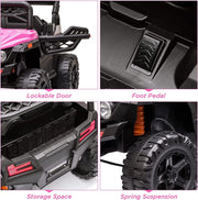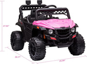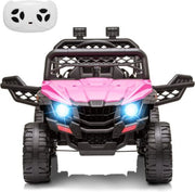 The 12V Kids Ride On Car Truck with Remote Control and LED Lights - Perfect Xmas Gift for Children is a versatile and exciting ride-on toy that will provide endless hours of fun for your child. With its manual and parental control options, this car allows parents to join in on the fun or let their child take control with the foot pedal. The manual mode offers two speeds, while the remote control mode allows for three speeds ranging from 1.8 to 3.7 mph. Safety is a top priority with this rc ride on car. It is certified by ASTM F963 CPSIA CPC and features a slow start function, parental remote control priority, adjustable seat belt, lockable doors, and spring suspension wheels. These features ensure that your child stays safe and secure while riding. Not only is this ride-on car safe, but it also provides built-in fun for your child. It comes equipped with an MP3 player, USB port, AUX input, FM radio, and bright LED headlights. Your child can listen to their favorite music or stories while cruising around in style. The car also features a rear storage bin, allowing your child to take their favorite toys along for the ride. The realistic UTV design of this ride-on car is sure to impress. With bright LED headlights, a control pedal, detachable trailer (optional), realistic engine sound, and horn, your child will feel like they are driving a real car or truck. The car is powered by a rechargeable 12V 4.5AH battery with two 390 motors, providing an authentic driving experience. Specifications: Color: Pink Material: Iron, Plastic Suitable Ages: 3+ years old Overall Dimensions: 39.17 x 25.98 x 27.95 inches Item Weight: 34 pounds Max Weight Capacity: 66 lbs Motor: 390*2 Battery: 12V 4.5AH battery Charger: 12V 500MA Charging Time: 8-12 hrs Speed: 1.8-3.7 mph The 12V Kids Ride On Car Truck with Remote Control and LED Lights - Perfect Xmas Gift for Children is the ultimate gift for your child. Its spacious seat with a seat belt ensures comfort and safety while driving. The lockable doors, MP3 player, AUX, USB port, FM radio, bright LED headlights, and Bluetooth connectivity provide endless entertainment options. The wear-resistant tires with spring suspension and slow start technology improve stability and protect your child. The rear storage bin allows your child to bring their favorite toys along for the ride. This electric car is the perfect birthday or Christmas gift for your child.