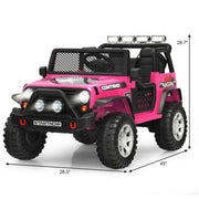 Product Description The 2-Seater 12V Electric Ride-On Truck for Kids with Remote Control Let your little adventurers embark on thrilling journeys with The 2-Seater 12V Electric Ride-On Truck for Kids with Remote Control. This ride-on truck is designed to provide a safe and exhilarating experience for children over 3 years old. With its realistic features and powerful performance, it is the perfect gift for your young explorers. Key Features: A Safe and Smooth Ride: Front and rear spring suspension ensures a smooth and stable ride on various terrains. Slow start function guarantees a safe playtime for your little ones. Ample seat with a seat belt offers comfort and security during the ride. Realistic Driving Experience: Openable doors, grid front window, and a steering wheel mimic the details of a real truck. The car toy roars to life when powered on, complete with beeping horns and LED lights. Offers forward and backward motion, as well as a rocking mode for added excitement. Two Control Modes: 2.4G remote control with three speeds allows parents to take control of the rc ride on truck. Self-driving mode, activated by the pedal and steering wheel, offers two optional velocities. Handle located under the car for easy movement and transportation. Music and Audio Options: Features built-in music and radio for an enhanced and enjoyable experience. MP3 and USB outlet allow for connecting other music devices or phones for more audio options. A Gift of Perfection: Comes in multiple color choices to suit your child's preferences. Solid PP cover ensures durability and longevity. Can support a maximum weight of 110 lbs. Product Specifications: Brand: Costway Theme: Cars Recommended Age Range: 3 Years and older Age Level: 3-4 Years, 4-7 Material: PP, steel Net Weight: 44 lbs Product Dimension: 45" x 28.5" x 28.7" (L x W x H) Seat Base Dimension: 18.5" x 8" (L x W) Battery: 12V/7AH Charging Time: 8-12 hours Speed: 1-5 mph Maximum Weight: 110 lbs