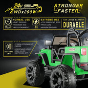 The 2-Seater 24V Electric Ride-On Truck for Kids with Parental Remote Control - US Version is the perfect gift for adventurous boys and girls. With its realistic appearance and high-performance 24V 2x200W Motor, this ride-on truck provides an exciting driving experience. Equipped with wear-proof EVA tires and a reinforced seat belt, it ensures safety and comfort during your kid's driving adventures. The soft start and soft brake technology, electron-assisted steering wheel, auto-reset overheat protector, and upgraded spring suspension system enhance the overall driving experience. Plus, it offers various additional features like music, Bluetooth, childhood story, and LED lights to inject fun into your child's driving experience. Key Features: Safety Guarantee: Certified by ASTM & CPC, with soft start & soft braking function, electron-assisted steering, auto-reset overheat protector, and reinforced seat belts 2-Seater - MAX SPACE: Designed with 2 spacious seats, allowing two kids aged 1-4 years and 3-8 years to drive together 24V with 2X200W Motors: Equipped with a powerful 24V battery and 2PCS 200W motor for enhanced driving ability Two Driving Modes: Switch freely between dual driving modes - parental remote control and kids manual operate Multiple Functions Ride for Fun: High-bright LED headlights, tail lights, and searchlights for a cool driving experience Product Specifications: Recommended Age: 3-8 years Seat Size: 18 inch Wheels Size: 14 inches Color Options: Red / Pink / Black / Green Suspension: Full-Metal Suspension Material: PP and ABS plastic, metal Overall Size: 48.5 in (L) x 34.7 in (W) x 31.5 in (H) Battery Type: 24V 9AH Charging Time: 8-12 hr Motor Type: 200W *2 Safe Speed: 1.8-4.9 mph Maximum User Weight: 130lbs (60 kg) Give your child the ultimate driving experience with the 2-Seater 24V Electric Ride-On Truck. It's the ideal gift for birthdays and holidays, providing endless fun and adventure for your little ones.