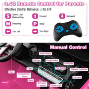 The 2-Seater Pink Battery Powered Ride-On Car with 3-Point Seat Belts and Doors - 12V is the perfect ride-on toy for adventurous kids. With its classical appearance, 180° rotatable mirrors, LED headlights, and laser lights, this car is sure to capture their imagination. The 2-seater design with 3-point seat belts and doors with safety locks allows your little one to enjoy safe driving with a friend.But safety isn't the only feature of this ride-on car. It also has a slow start function that provides a gradual acceleration and brake, ensuring a smooth and comfortable ride. The spring suspension adds to the smoothness of the drive, making every journey enjoyable.Children will love the interactive features of this car. They can operate the car via the steering wheel, control pedal, and gear lever, giving them a real driving experience. The USB port and wireless connection allow them to listen to their favorite music while driving, and the FM radio function adds even more fun to their adventures.Parents can also join in on the fun with the 2.4G remote control. They can operate the car and ensure their child's safety from a distance. This ride-on car is not just a toy, it's a tool for parents to bond with their children and create lasting memories.With its durable and portable design, this ride-on car is suitable for both indoor and outdoor use. It is made from 100% new PP and steel materials, ensuring its longevity. The size of the car is 49.6" x 30.7" x 31.1" (L x W x H), and it has a weight capacity of 130 lbs. The car itself weighs 53 lbs.Assembly is required for this ride-on car, but it is easy to put together with the included instructions. The firmness of the car is medium, providing a comfortable and secure seat for your child. It is a one-piece set that includes the ride-on truck, a 2.4G remote control, a charger, and an instruction manual.Let your child's imagination run wild with the 2-Seater Pink Battery Powered Ride-On Car with 3-Point Seat Belts and Doors - 12V. It's a modern and stylish ride-on truck that will provide hours of fun and adventure for your little one.