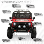 The Adventure-Ready 2 Seater Electric Ride-On Jeep for Kids with Remote Control Get ready for an exciting ride with the Adventure-Ready 2 Seater Electric Ride-On Jeep for Kids with Remote Control. This ride-on jeep is perfect for little adventurers who are ready to explore the outdoors and have some fun. With its rugged design and powerful performance, this rc ride on jeep is built to handle any terrain. Key Features: Soft EVA foam rubber tires with anti-skid pattern for superior traction on different terrains Wide seat with safety belt, designed for two kids Front and rear LED lights for enhanced visibility Lockable double doors for added safety Connect your portable devices to play music or stories with USB, SD card, Bluetooth, and Radio support Realistic horn on the steering wheel Remote control and manual driving options Product Specifications: Dimension: 46.5"(L) x 30.5"(W) x 30"(H) Battery: 12V7AH Item weight: 42lbs Weight capacity: 110 LBS Recommended Age Range: 3-8 year old Speed: 1.2-5mph Recharge time: 8-12 hours Driving time: Around 40 minutes-1 hour (depends on children's weight and road surface) With its impressive features and specifications, the Adventure-Ready 2 Seater Electric Ride-On Jeep for Kids with Remote Control is the perfect gift for kids aged 3-8 years old. Whether they want to drive it themselves or use the remote control, they'll have a blast exploring the outdoors in this ride-on jeep.