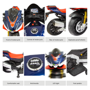 Your kids will love the Aprilia 12V Electric Motorcycle for Kids - 2 Wheels, Ages 3-10. This powerful ride-on toy will provide your little ones with a real driving experience that they won't forget. Equipped with a 12V battery and double motors, this motorcycle offers a thrilling ride that will make your kids feel like they're cruising on a real bike. The large seat is designed to accommodate two kids, allowing them to share the fun and excitement together. Real driving experience with one-button starting Grid windshield for an off-road style LED lights to brighten the surroundings in the darkness Foot pedal for easy acceleration Training wheels for balance training Shock absorption wheels and suspension system for safety Resistant wheels for riding on various terrains Large and comfortable seat for two kids MP3 player for music enjoyment Racing foot brake for added excitement Painting color for a stylish look The Aprilia 12V Electric Motorcycle for Kids - 2 Wheels, Ages 3-10 is designed with safety in mind. The included training wheels help your kids learn to balance and ride with confidence. The shock absorption wheels and suspension system ensure a smooth and stable ride, even on bumpy surfaces. With resistant wheels, your kids can ride on different kinds of ground such as grass, brick road, wood floor, asphalt ground, and plastic runway. This ride-on toy offers endless possibilities for outdoor and indoor adventures. With its bright LED headlights and tail lights, this motorcycle is not only fun to ride but also provides added visibility in low-light conditions. The large and comfortable seat can hold two kids, allowing them to enjoy the ride together. The Aprilia 12V Electric Motorcycle for Kids - 2 Wheels, Ages 3-10 is easy to assemble with the detailed instruction and install video provided on the product detail page. Product Specifications: Brand: Aprilia Year: 2022 Theme: Motorcycle for kids Recommended Age Range: 3 Years Old + Age Level: 3-10 Years Character Family: Toy Story Color: Black/Blue Battery Type: 12V 10AHĂ—1 Run Speed: 3-6 KM/Hour Overall Dimension: 51.2"Ă—29.5"Ă—20.5" Weight Capacity: 110 LBS The Aprilia 12V Electric Motorcycle for Kids - 2 Wheels, Ages 3-10 is the perfect ride-on toy for your adventurous little ones. Let their imaginations run wild as they zoom around on this exciting motorcycle. Order yours today and watch as your kids create memories that will last a lifetime.