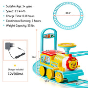 The Blue Electric Kids Train Toy with Unique Design & Stickers - 6V Motorized Ride-On has 6 wheels, providing a stable structure for safe and smooth rides. The wheels also have anti-slip bands on 2 wheels, ensuring more steady movement. The train set includes 1 x Ride On Train, 16 x Track, 1 x Charger, and 1 x Instruction.