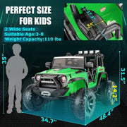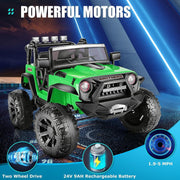 The Electric 2-Seater Ride On Car for Kids with Remote Control - 24V 2x200W 2WD Toy Vehicle is the perfect gift for adventurous boys and girls who want to drive in style. This ride-on truck offers a smooth and exciting riding experience, just like a real car. With its 2-seater design, your child can bring a friend along for the ride. The spring suspension systems ensure a comfortable and stable ride, even on rough terrain. And with the one-button soft-starting technology, your child can easily control the speed of the car. Safety is a top priority with this ride-on truck. It comes with manual and parental control options, so you can choose whether your child drives or you take control with the remote. The patented electron-assisted steering wheel and wheel auto-return feature make steering easy and safe. The foot pedals are designed for little feet, and the car is equipped with wear-proof tires for added durability. Plus, the seat belts and locking doors provide extra protection for your child. But the fun doesn't stop there! This Hikole Kids electric car is packed with features that will keep your child entertained for hours. The bright LED lights in the front and back of the car add a cool and stylish touch. The multifunction console allows your child to connect their favorite music through Bluetooth, AUX, or USB. They can also control the lights for a more colorful playing experience. When it comes to details, this ride-on truck doesn't disappoint. It comes in a range of rich colors, including black, green, blue, and pink. The size of the car is 48.4"L x 34.7"W x 31.5"H, making it the perfect size for kids. The battery has a capacity of 24V 9AH, and the car is powered by two 200W motors. It can reach speeds of 1.9-5mph, with three speed options to choose from. The maximum capacity of the car is 110 lbs, making it suitable for kids aged 3-8. But wait, there's more! This ride-on truck comes with a few extra tips and features. It is delivered in two boxes, so make sure you have received both before starting assembly. The spring suspension system ensures a smooth and comfortable ride on any terrain. The versatile music player options allow your child to enjoy their favorite tunes while driving. And when playtime is over, the retractable handle hidden in the rear makes it easy for parents to move the car around. Let your child's adventure shine with the Hikole kids electric car. Equipped with front and rear headlights, as well as four LED spotlights, this car is perfect for kids who love exploring day or night. So why wait? Get the Electric 2-Seater Ride On Car for Kids with Remote Control - 24V 2x200W 2WD Toy Vehicle today and watch your child's imagination soar! 2-seater design Spring suspension systems One-button soft-starting tech 3 speeds up to 4.9 MPH Runs up to 120 mins on a full charge Switch forward and reverse Manual & parental control Patented electron-assisted steering wheel & wheel auto-return Foot pedals Wear-proof tires Seat belts Locking doors Bright LED lights Bluetooth, AUX connection Multifunction console Color options: Black, Green, Blue, Pink Size: 48.4"L x 34.7"W x 31.5"H Battery: 24V 9AH Power: 200W*2 Speed: 1.9-5mph Max capacity: 110 lbs