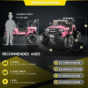The Electric 4 Wheeler ATV Car Jeep Truck for Kids - 12V/24V Battery Powered Ride-On Toy is the perfect gift for your adventurous little ones. With its powerful motor and durable construction, this ride-on toy is designed to provide endless fun and excitement. Let's explore each variant in detail: Type 1: 12V 2x35W Electric Ride On Car ATV Quad Color options: Pink, Black, Blue, White Motor: 35W*2 Battery: 12V - 4.5AH Material: PP, Iron Net Weight: 21.6 lbs Loading Capacity: 68 lbs Overall Dimensions: 34.6" L X 18.1" W X 20.1" H Recommended for Kids: 2-8 years old Speed: Low speed of 1.5mph, high speed of 2.8mph Key start, high/low speed, USB, MP3 interface, power display, volume adjustment, slow start Charging time: 6-8 hours, Long battery life-up to 60-90 minutes (Based on child weight) Certification: ASTM /F963, FCC, CE, ROHS The ride-on ATV features advanced slow start technology for higher protection, ensuring a smooth and safe driving experience for your kids. The comfortable kids-friendly seat provides optimal comfort during their thrilling rides. With variable driving speeds and directions, your kids can easily operate the ATV like a real car. The horn sound and simulative acceleration sound buttons on the steering wheel add to the realistic driving experience. The rechargeable design allows for long hours of driving fun, and the power display reminds you to charge it in time. The ATV is equipped with wear-resistant wheels, making it suitable for any terrain. Whether your kids want to ride on grass, beach, rubber track, or cement ground, they can enjoy themselves everywhere. With its authentic appearance and various features like MP3 and USB connectivity, this ATV is sure to bring infinite fun to your kids. Let this battery-powered quad ATV accompany your kids and create cherished childhood memories. Crafted with high-quality materials and certified by ASTM /F963, it guarantees reliability and durability. Type 2: 12V 2*30W 2-Seaters Electric Ride On Truck Car Color options: Pink, Black, White, Red Recommended Age: 3-7 years Material: PP and ABS plastic, metal Battery Type: 12V 7AH Motor Type: 30W * 2 Maximum User Weight: 67 lbs Maximum Speed: 3-5 km/h (3 mph) Charging Time: 8-12 hours Run Time: 2-2.5 hours (depending on the child's weight and speed) Music Function: AUX & USB port / Bluetooth / built-in music Controller Batteries: 2 AAA batteries (not included) Overall Size: 38.5 inches (L) x 23.5 inches (W) x 26 inches (H) This electric ride-on truck car is the perfect gift for your aspiring little driver. It features a parent-child remote control mode, allowing you to control the car and enjoy the joy of being with your baby. The adjustable seat belts, bright LED headlights, lockable double doors, and impact-absorbing shock absorbers make the driving experience realistic and safe. The truck car is equipped with a 30W*2 strong motor, providing dual driving force and sufficient power. The spring suspension device ensures a comfortable and smooth ride on different terrains. With its built-in music player, AUX/USB ports, and Bluetooth connectivity, you can connect your device and play your child's favorite music or stories. The multifunctional control panel includes an oversized color LED display, speed adjustment, simulated car-style horn, music playback, and volume adjustment, adding to the driving fun. This ride-on truck car is designed for children aged 3-7 years and has passed ASTM F963 & CPSIA Children Product Certification, ensuring safety and durability. Type 3: 24V 2x200W 2 Seater Electric Ride On Truck Two modes design: Parent-child remote control mode and steering wheel and pedal power mode Powerful 24V battery Adjustable seat belts, LED headlights, lockable double doors, and impact-absorbing shock absorbers Connectivity options: AUX, USB, Bluetooth Maximum Speed: 3-5 km/h (3 mph) Charging Time: 8-12 hours Run Time: 2-2.5 hours (depending on the child's weight and speed) Material: PP and ABS plastic, metal Recommended Age Range: 3-9 years Suspension: Spring Suspension This 2-seater electric ride-on truck offers two modes of operation for maximum flexibility. In the parent-child remote control mode, you can control the car through the remote control, ensuring the safety of your child. In the steering wheel and pedal power mode, children can independently operate their own electric ride-on truck car. The truck is equipped with a powerful 24V battery and traction tires, allowing it to drive on different terrains. The adjustable seat belts, LED headlights, lockable double doors, and impact-absorbing shock absorbers provide safety and comfort during the ride. You can connect your device via AUX, USB, or Bluetooth to play music or stories that your child loves. With its realistic design and high-quality construction, this electric ride-on truck is suitable for children aged 3-9 years. The spring suspension ensures a smooth and enjoyable ride. Let your child's driving dream come true with this amazing ride-on truck!