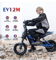 The Electric Dirt Bike for Kids Ages 3-12: The Perfect Blue Ride Introducing the Electric Dirt Bike for Kids Ages 3-12: The Perfect Blue Ride! This ride-on toy is perfect for young adventurers who are ready to explore the great outdoors. With its sleek design and powerful performance, this electric dirt bike will provide endless hours of fun and excitement. Key Features: Brand: EverCross Weight Capacity: 143 lbs Frame Material: Steel Recommended Age Range: 3-12 years Age Level: 1-2 Years Weight: 143 lbs Product Specifications: Brand: EverCross Weight Capacity: 143 lbs Frame Material: Steel Recommended Age Range: 3-12 years Age Level: 1-2 Years Weight: 143 lbs Designed for children aged 3 to 12, this electric dirt bike is the perfect choice for young riders who are ready to embark on thrilling adventures. The sturdy steel frame ensures durability and stability, allowing kids to confidently navigate various terrains. With a weight capacity of 143 lbs, this ride-on toy can accommodate children of different sizes. Equipped with a powerful electric motor, this dirt bike delivers impressive performance. Kids can experience the thrill of riding at speeds suitable for their age level, providing a safe yet exhilarating experience. The easy-to-use controls make it simple for young riders to accelerate, brake, and steer, giving them full control over their exciting ride. Whether it's exploring the backyard, racing with friends, or navigating off-road trails, this electric dirt bike is built to handle it all. The vibrant blue color adds a touch of style, making this ride-on toy stand out from the rest. Let your child's imagination run wild as they embark on countless adventures with the Electric Dirt Bike for Kids Ages 3-12: The Perfect Blue Ride.
