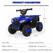 The Electric Kids ATV with Forward/Reverse Switch and 4-Wheel Beach Buggy Design is a high-performance ride-on car that combines the thrill of driving with the adventure of off-road exploration. With its life-like ATV look, this battery-powered kids ATV is the perfect toy to accompany your little ones and create unforgettable childhood memories.Featuring white anti-slip wheels, this motorized ride-on toy provides excellent traction on various terrains, allowing your child to freely drive both indoors and outdoors. This not only enhances their coordination skills but also develops their emergency response abilities, making it a fun and educational toy.Operating this mini quad ATV is a breeze. Simply turn on the power button and press the forward/reverse switch, and your child can control the handle to drive in any direction they desire. There's no need for any complex operations, as even the littlest kids can enjoy endless self-driving fun.We understand the importance of driving comfort, especially for young riders. That's why our kid ATV features an ergonomic curved seat with a wide design that perfectly fits the child's body shape. This raises the comfort level to new heights, ensuring a smooth and enjoyable ride every time.Built to last, this mini quad ATV is made of high-quality PP and iron frame, providing superior strength and durability. It can withstand a load capacity of up to 66 pounds, making it suitable for children of various ages. Safety is also a top priority, so you can have peace of mind knowing that your child is riding a reliable and sturdy toy.Key Features:- Life-like ATV look for an adventurous ride-on experience- White anti-slip wheels for excellent traction on various terrains- Simple operation with a power button and forward/reverse switch- Ergonomic curved seat for optimal driving comfort- Made of high-quality PP and iron frame for durability- Load capacity of up to 66 pounds for children of various agesProduct Specifications:- Style: ATV- Gender: Unisex- Net weight: 5.3kg- Size: 68*43*47 CM- Battery: 6V 7AH- Speed: 2.5-4.5 km/h- Charging time: 6-9 hours- Product load: 60 kg- Functions: early education, story, music, USB, MP3 socket, LED lightAssembly instruction manual and product instruction manual are included for easy setup and operation.With the Electric Kids ATV with Forward/Reverse Switch and 4-Wheel Beach Buggy Design, your child can embark on exciting adventures both indoors and outdoors. Let their imagination run wild as they explore new territories and create lasting memories. Order now and give your little one the ride-on toy they've always dreamed of.