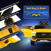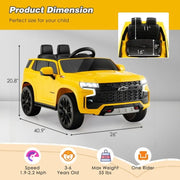 The Electric Kids Ride-On Car with 3 Speeds, All-Terrain Wheels, and 2.4G Remote Control - 12V is the ultimate toy for adventurous young drivers. Crafted from durable PP and sturdy metal, this ride-on car is designed with safety as the top priority. It is certificated by ASTM and CPSIA, ensuring the highest quality and safety standards. The slow start and stop technology, along with the emergency brake function on the remote control, provide added peace of mind for parents. The openable doors with safety locks and wide seat with safety belt ensure that your child is secure during their rc ride on adventures. But safety isn't the only thing that sets this ride-on car apart. Its stunning appearance and light effects make it look like a real Chevrolet Tahoe SUV. The fantastic headlights, taillights, and lighted dashboard will surely impress your little driver. They will feel like they're driving a luxury car! Operating this ride-on car is a breeze with the 2 modes available. Parents can use the 2.4G remote control to safely guide their little one when they are just learning to drive. The one-key start button, accelerator pedal, and steering wheel offer super easy operation and a realistic driving experience. Kids can freely choose between high and low speeds and move forward or reverse as they please. But the fun doesn't stop there! This ride-on car is equipped with a multifunctional media player that includes dynamic songs, absorbing stories, and even FM radio. With the aux input, USB port, TF slot, and advanced wireless connection, children can choose their favorite entertainment audio sources for a joyful journey. Powered by 2 powerful 35W motors, this high-performance ride-on car can reach speeds up to 2.2 mph. The 4 wear-resistant wheels with spring suspensions effectively reduce bumps, allowing the car to drive smoothly on various terrains such as asphalt road, cement road, and brick road. The 12V rechargeable battery provides a longer playtime, ensuring endless fun for your little driver. With its ASTM and CPSIA certification, this ride-on car guarantees safety and high-quality. The slow start and brake system avoids sudden impacts, while the lockable doors and safety belt provide great protection for children. The enlarged seat with backrest offers a comfortable sitting experience, and the bright headlights, taillights, and lighted dashboard give the car an eye-catching look. The 2.4G parental remote control features an emergency brake and 3 speeds selection, giving parents full control over the ride-on car. The one-key start, foot pedal, and steering wheel make operation easy for kids. The built-in music, stories, FM radio, horn, and startup sound add to the infinite fun. The ride-on car is equipped with a spring suspension system that reduces vibration and keeps the ride smooth. The 4 wear-resistant and non-slip wheels are suitable for various terrains, ensuring a safe and enjoyable ride. The rechargeable battery ensures a super long duration of playtime, so your child can have non-stop adventures. Get ready for an exciting and adventurous ride with the Electric Kids Ride-On Car with 3 Speeds, All-Terrain Wheels, and 2.4G Remote Control - 12V. Let your child's imagination run wild as they explore the world in their very own ride-on car. Key Features: Safety Always Come First: Crafted from durable PP and sturdy metal, certificated by ASTM and CPSIA Stunning Appearance and Light Effect: Looks like a real Chevrolet Tahoe SUV with fantastic headlights, taillights, and lighted dashboard 2 Modes to Operate: Parents can use the 2.4G remote control for safe guidance, one-key start button, accelerator pedal, and steering wheels for easy operation Music Player for Joyful Journey: Equipped with a multifunctional media player that contains dynamic songs, absorbing stories, and FM radio High-performance Ride on Car: Driven by 2 powerful 35W motors, reaches a speed up to 2.2 mph, 4 wear-resistant wheels with spring suspensions Product Specifications: Color: Yellow Material: PP, Steel Overall Dimension: 26" x 40.9" x 20.8" Net Weight: 34 lbs Weight Capacity: 55 lbs Suitable Age: 3-6 Years Old Speed: 1.9-2.2 mph Battery: 12V/7Ah x 1 Charging Time: 8-12 Hours Battery Type of Remote Control: 2 x 1.5V AAA Batteries