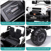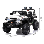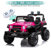 The Electric Off-Road Truck for Kids with LED Lights - 12V 4.5AH Battery Powered Ride On Toy is the ultimate choice for adventure-loving kids. This ASTM-certified electric car is made with high-quality materials, ensuring safety and durability for your child's playtime. Whether they want to drive manually or use the remote control, parents can safely guide their child on exciting rides. The adjustable seat belt provides added safety and comfort during the journey.Key Features:- ASTM-Certified for safety- Easy to assemble, ensuring quick and hassle-free setup- Automatic reset fuse for protection circuit, ensuring safety during playtime- Built-in AUX outlet allows kids to plug in media devices and enjoy their favorite music while riding- Soft start technology prevents sudden acceleration or braking, keeping kids safe from any danger- Rechargeable 12V battery with included charger provides hours of playtime- 2.4G remote control with 3 different speed modes, giving parents full control over the ride- Adjustable seat belt for safe and comfortable use- Recommended for single riders ages 3-6, perfect for young adventurersSpecifications:- Color options: Black, White, Red, Blue, Rose Red, Pink- Material: PP Plastic, Metal- RC Mode: 3 Speeds Options- Manual Mode: 2 Speeds Accessible- Maximum User Weight: 66lb / 30kg- Charge Time: 8-12 Hrs.- Run Time: 1-2 Hrs.- Speed: 1.9-2.6 mph- Battery Type: 12V 4.5AH- Controller Battery: 2 x AAA Batteries (not included)- Overall Dimensions: (41.9 x 28.2 x 28.1)" / (106.43 x 71.63 x 71.37)cm (L x W x H)- Recommended for Single Rider Ages 3-6Package Includes:- 1 x Electric Car- 1 x 2.4G Remote Control- 1 x Charger- 1 x ManualGet ready for thrilling off-road adventures with the Electric Off-Road Truck for Kids with LED Lights - 12V 4.5AH Battery Powered Ride On Toy. Let your child's imagination soar as they explore the world in their very own remote control ride on truck. Order now and give your little one the gift of endless fun and excitement!