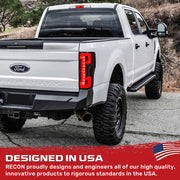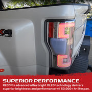 Give your 2017–2019 Ford Super Duty a bold upgrade with RECON’s brightest OLED tail lights, available in smoked, dark red smoked, red, and clear lenses. Smoked Lens (#264299BK) features a dynamic start-up light greeting sequence, combining cutting-edge style with top-tier performance. Built for high visibility and durability in any condition. Compatible with trucks that came with factory HALOGEN tail lights only; if your truck came with factory LED w/ BLIS, you will need part #264299LED series.