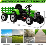 The Green 12V Ride-On Tractor with Trailer and Remote Control for Kids, Featuring LED Headlights is a must-have toy for adventurous and imaginative children. With its realistic tractor design and detachable trailer, kids can engage in loading and delivering farm products, dolls, snow, straw, and more, creating a world of endless possibilities. The battery-powered ride-on tractor features a slow start function, ensuring the safety of your children as they embark on exciting journeys.Key Features:- Realistic tractor design with a detachable trailer for transporting toys, water bottles, flowers, pumpkins, and more- Slow start function for added safety- Parent remote control for double insurance in driving- Adjustable seat belt and spacious seat for comfort and freedom of movement- Armrest for additional protectionSpecifications:- Age Level: 3-4 Years, 4-7 Years, 8-11 Years- Assembly Required: Yes- Brand: Unbranded- Item Dimensions: 54 x 20 x 21 inches (LxWxH)- Item Weight: 28 Pounds- Material: Iron, Plastic- Recommended Age Range: 3+ Years- Size: 25W-Tread Tire- Theme: Vehicle- Year: 2022The Green 12V Ride-On Tractor with Trailer and Remote Control offers two modes of control, allowing kids to drive on their own and develop their hand-eye coordination. The foot pedal and shift add to the excitement and give children a sense of independence. The rc ride on tractor is also equipped with Bluetooth, a USB port, and MP3 capabilities, providing endless fun and entertainment for kids as they listen to their favorite tunes while cruising around.Safety is a top priority with this ride-on tractor. It is certified by ASTM F963 CPSIA CPC, ensuring that it meets the highest safety standards. The adjustable seat belt and solid armrest provide additional protection, giving parents peace of mind while their children enjoy their ride-on adventures.Overall Dimensions: 54"(L) x 20"(W) x 21"(H)Weight Capacity: 66 lbsRecharge Time: 8-12 hoursThe Green 12V Ride-On Tractor with Trailer and Remote Control is the ultimate toy for kids who love to explore and have fun. Its realistic design, safety features, and additional specifications make it a top choice for parents who want their children to have a thrilling and safe ride-on experience. Get ready for hours of excitement and adventure with this amazing ride-on tractor!