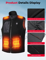Our men's heated vest for winter is crafted from top-notch lamb wool material, featuring a stand-up collar design that elevates its luxurious appeal and delivers a cozy and comfortable wearing experience. The user-friendly design of the inner pocket and two side zip pockets allows you to easily store personal items without worrying about losing them. It provides both warmth and convenience for your winter lifestyle.