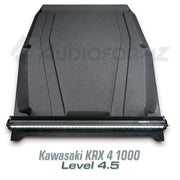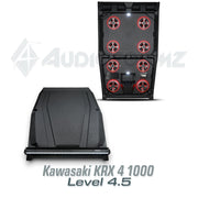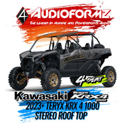 The AudioFormz roof top stereo system is expertly designed for the Kawasaki KRX 4 1000, known for its impressive build quality, reliability, and functionality. This stereo top, a perfect match for the Kawasaki's rugged appeal, is recognized as one of the lightest yet strongest in the market. It's crafted from solid hand-laid molded fiberglass, combining durability with exceptional sound quality.