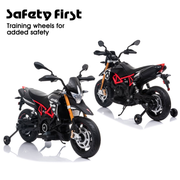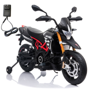 The Kid's Electric Motorcycle with Training Wheels, LED Lights, and MP3 Player - Black (12V) is an exciting and adventurous ride-on toy that will bring endless fun and excitement to your little ones. This Tobbi kids licensed Aprilia 12V ride on motorcycle features a sleek and appealing design, complete with two training wheels for added stability. With this ride-on motorcycle, your children can develop their motor skills, imagination, and creativity as they sit on the wide ergonomic seat and grasp the nonslip handlebars. They can easily move the dirt bike forward or backward by simply switching on the start-up key. This electric motorcycle is packed with realistic features that will enhance your child's driving experience. It is equipped with bright headlights and tail-lights, creating a realistic driving atmosphere. The USB/SD/TF slot and MP3 port allow your little ones to enjoy their favorite music, stories, and more while riding. The adjustable volume adds to the fun and excitement. Safety is a top priority, and this ride-on motorcycle meets the safety standards for ASTM F963 and CPSIA. The rear wheel is equipped with shock-absorbing spring suspension, reducing the impact from various terrains and ensuring a smooth ride. The Kid's Electric Motorcycle with Training Wheels, LED Lights, and MP3 Player - Black (12V) is made from sturdy and kid-friendly plastic, ensuring durability and long-lasting use. It is suitable for children aged 3 to 6 years old, with a maximum weight capacity of 55 lbs. Assembly is easy and hassle-free with the detailed installation manual included in the package. Specifications:- Color: Black- Main Material: PP- Net Weight: 22 lbs- Overall Dimensions: 42.52"L x 18.89"W x 27.95"H- Weight Capacity: 55 lbs- Power Way: Charging Type- Motor: RS390/12V/13000RMP- Charger: 110 or 220V 50HZ (Input); DC12V 700MA (Output)- Charging Time: 8-12 Hours- Battery: 12V 4.5Ah x 1- Average Battery Life: Approximately 300 Times- Fuse: 10A- Continuous Run Time: 1 Hour After Full Charge (Depend on kids weight, terrain and speed)- Recommended Age: 3-6 Years OldPackage includes:- 1 x Kids Ride on Motorcycle- 1 x Charger- 1 x Screw Kit- 1 x Sticker- 1 x User ManualKey Features:- Aprilia licensed 12V kids ride on motorcycle with 2 training wheels and bright head & rear lights- Sturdy, kid-friendly plastic meets the safety standards for ASTM F963, CPSIA- Forward and backward function allows unisex child to drive freely- Rear wheel with shock-absorbing spring suspension to reduce the impact from various terrains- USB/SD/TF slot, MP3 port, stories, music, and adjustable volume brings lots of fun in driving- Wide seat provides a comfortable driving experience- Easy assembly with a detailed installation manualSpecifications:- Age Range: 3 to 6 Years- Volts: 12 V- Maximum Weight: 55 lb- Vehicle Type: Motorcycle- Seating Capacity: 1- Color: Black- Assembled Product Dimensions (L x W x H): 42.52 x 18.89 x 27.95 InchesThe Kid's Electric Motorcycle with Training Wheels, LED Lights, and MP3 Player - Black (12V) is the perfect gift for your kids. Let them embark on exciting adventures and create unforgettable memories with this thrilling ride-on motorcycle. Don't hesitate to buy this motorcycle toy and provide your children with a real driving experience.