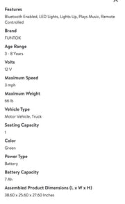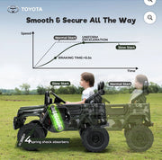 Unleash Adventure with the Officially Licensed TOYOTA FJ Cruiser Ride-On Truck Imagine your little one taking the driver’s seat of a genuine-looking TOYOTA FJ Cruiser, built just for kids. This 12V battery-powered ride-on truck brings the classic FJ Cruiser design to life with stunning authenticity. Every curve, every grill detail, every bold line is faithfully recreated to give your child a thrilling and immersive driving experience. Whether you’re guiding them via the included parent remote or watching them explore on their own, this ride-on truck is designed to spark imagination, build motor skills, and deliver endless joy. Why Parents and Kids Love This Ride-On Truck True-to-Scale Model: Meticulously designed to mimic the iconic TOYOTA FJ Cruiser, providing your child with a realistic driving experience. Dual Driving Modes: Let your little driver steer independently or take over with the 2.4G parent remote control for added safety and guidance. Extended Playtime: Equipped with a 12V 7Ah battery—over 25% more capacity than standard 4.5Ah options—so adventures last longer without constant recharging. Sturdy Performance: Two powerful 25W motors ensure smooth acceleration and the ability to conquer grass, brick paths, asphalt, and other terrains. Comfort on Every Ride: Spring suspension cushions bumps and the slow-start feature guarantees a gentle acceleration, preventing sudden jolts. Kid-Friendly Controls: One-button start, realistic foot pedal acceleration, bright LED headlights, and an easy-grip steering wheel put the fun in control. Entertainment Hub: USB port, MP3 player, FM radio, Bluetooth connectivity, and built-in songs provide a mobile concert wherever your child goes. Available Color Variants We know every child has their own style. That’s why the TOYOTA FJ Cruiser ride-on truck comes in four vibrant colors. Each color offers the same premium features and performance—just pick the one that matches your child’s personality! 1. Pink FJ Cruiser Ride-On Truck Let your little princess rule the road in glossy pink! The Pink variant stands out with its cheerful hue, creating a picture-perfect scene for every backyard adventure. Kids love the bright color, while parents appreciate the high-quality finish that resists scratches and scuffs. 2. Black FJ Cruiser Ride-On Truck For the young trendsetter who wants a sleek and stylish ride, the Black model brings timeless elegance. The deep black exterior is complemented by chrome-like accents on the grill and wheel rims. This color choice feels rugged yet refined—perfect for fearless explorers. 3. Green FJ Cruiser Ride-On Truck Bring a dash of nature to every play session with the bold Green option. This earthy shade inspires outdoor adventures, from garden safaris to driveway expeditions. The Green ride-on truck looks fantastic against grass or concrete, and its glossy finish highlights every sculpted detail. 4. Yellow FJ Cruiser Ride-On Truck Brighten up every journey with the cheerful Yellow variant. Sunny and fun, this color sparks happiness and excitement. The Yellow ride-on truck is especially visible in low-light conditions, making it a safe choice for dusk adventures as well. Built for Little Drivers (Ages 3–8) This ride-on truck is crafted with young drivers in mind, offering the perfect balance of safety and thrill. The spacious 15-inch-wide seat offers plenty of room for kids of various sizes, while the low center of gravity ensures stability. From ages 3 to 8, your child will grow into this ride-on and enjoy years of imaginative play. Key Features & Specifications Battery Type: 12V 7Ah rechargeable lead-acid battery (8–12 hours charge time for 2–2.5 hours of run time). Drive Motors: Dual 25W motors deliver smooth power and can handle grass, pavement, brick, and more. Maximum Speed: Adjustable from 1.6 to 2.8 mph—perfect for little beginners to gain confidence. Weight Capacity: Supports up to 66 lbs, accommodating toddlers through early elementary years. Product Dimensions: 38.6″ L x 25.6″ W x 27.6″ H, fitting easily in driveways, backyards, and garages. Spring Suspension: Absorbs bumps for a comfortable ride, even over rough surfaces. Slow-Start Function: Ensures gentle acceleration, preventing sudden jolts and giving parents peace of mind. Parent Remote Control: 2.4G wireless remote (requires 2x AAA batteries, not included) lets adults guide, stop, and steer the ride-on. Entertainment Features: Built-in MP3 player, USB port, FM radio, Bluetooth connectivity, and pre-loaded tunes. Interactive Elements: Realistic foot pedal, working LED headlights, honking horn, and accurate steering wheel for authentic driving fun. Benefits Beyond the Basics This isn’t just a car for kids—it’s a confidence builder, a creativity booster, and a friendship starter. Here’s how this ride-on truck benefits your family: Enhanced Motor Skills: Steering, accelerating, and stopping helps develop coordination and balance in young children. Boosted Confidence: Mastering control of their own ride-on truck gives kids a sense of independence and accomplishment. Encourages Outdoor Play: Getting behind the wheel means more time away from screens and more time exploring the world outside. Social Interaction: Ride-on adventures are perfect for siblings and friends, encouraging cooperative play and imaginative scenarios. Family Bonding: Use the parent remote control to include yourself in every ride, creating shared memories and laughter. The Perfect Gift for Any Occasion Looking for a birthday surprise, holiday gift, or just a special treat? The officially licensed TOYOTA FJ Cruiser ride-on truck is an unforgettable present. Wrapped up or ready to roll, this ride-on promises wide-eyed smiles, bursts of laughter, and countless stories of epic journeys across driveways and backyards. Give your child the gift of freedom—to imagine, to explore, and to conquer every terrain. What’s in the Box? 1 x Toyota FJ Cruiser Ride-On Truc
