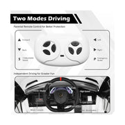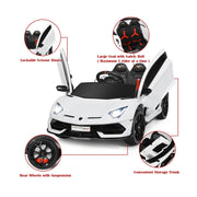 The Licensed Lamborghini SVJ RC Ride-On Car for Kids with Trunk & Music - 12V White Get ready to embark on a thrilling adventure with the Licensed Lamborghini SVJ RC Ride-On Car for Kids with Trunk & Music. This stylish rechargeable toy vehicle is designed to impress children over 3 years old with its cool and stylish appearance. Whether they choose to drive it themselves or let parents take control with the remote, this ride-on car offers a real driving experience filled with joy and excitement. Key Features: 2 Driving Modes: Kids can operate the car by themselves using the foot pedals and steering wheel, or parents can take control with the 2.4G remote control device. Multi-Media Center: Children can listen to music while driving, thanks to the USB and TF card slot that allows them to connect electronic devices. They can also adjust the volume and switch modes through the console. Realistic Experience: The built-in horn and LED lights add to the fun and provide a joyful and realistic driving experience. Maximum Safety: The spacious seat comes with a safety belt to ensure a safe driving environment for your little one. The wheels with spring suspension system guarantee smooth riding on both flat and tough roads. The soft start function prevents sudden starts or stops that could frighten the child. Powerful Motor & Rechargeable Battery: The high-performance motor ensures the remote control ride on car can conquer all kinds of tough terrains. The 12V battery can be fully charged within 8-12 hours, providing a longer continuous running time. Perfect Gift: With its eye-catching look and streamlined body, this fashion car will undoubtedly become a favorite among children. The cool scissor doors add an attractive touch. It is the best gift for birthdays or Christmas. Product Specifications: Color: White Material: PP + Iron Dimension: 48.5''x 27'' x 17.5'' (LxWxH) Net Weight: 38 lbs Maximum Capacity: 55 lbs Battery: 12V Charger: 12V 900MA Suitable Age: 3+ Years Charge Time: 8-12 hours Package Includes: 1 x Kids Ride-on Car 1 x Adaptor 1 x Manual