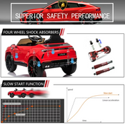 The Licensed Lamborghini Urus Kids Ride-On Truck with Remote Control - 12V Battery Powered is the ultimate ride-on toy for your child's outdoor adventures. With its classic Lamborghini Urus design, this remote control ride on truck is sure to turn heads as your child cruises around the neighborhood. Equipped with wear-proof tires and a seat belt, this ride-on truck ensures your child's safety and comfort during their driving experience. For added peace of mind, you can control the vehicle with the provided remote control if your child is not yet ready to take the wheel. The ride-on truck features subtle high-end designs, such as soft-starting technology and a spring suspension system, which enhance the overall driving experience. Your child will feel like they're driving a real car with the realistic working LED headlights and adjustable seat belt. But the fun doesn't stop there! This ride-on truck also comes with various additional functions to inject even more excitement into your child's driving experience. They can listen to their favorite tunes through the MP3 player, which has a USB port and FM radio. The truck also features LED lights that add a touch of style and fun. Whether it's a birthday gift or a Christmas present, this electric ride-on truck is sure to bring joy to your child's face. They will love the thrill of driving their very own Lamborghini Urus and exploring the world around them. Key Features: Officially licensed by Lamborghini 2.4Ghz parental remote control Remote control has forward/reverse controls and speed selection 3 different speed modes Recommended for children 3 to 6 years old 2 motors drive and long battery life provide extended entertainment time MP3 Player with USB port & FM Radio Rear Spring Shock Suspension Realistic working LED Headlights Soft-starting technology for smooth launches and stops Adjustable seat belt for safe and comfortable use Push-start button, speed option button, and steering wheel for easy driving Long battery life - up to 60-120 minutes per charge (based on child weight) Easy to assemble Product Specifications: Color: Red Material: PP Iron+ Electronic Components Net Weight: 29.7 lbs Battery: 12V4.5AH X 1 Motor: 35W X 2 Suitable Age: 3-6 years Loading Capacity: 61.6 lbs Overall Dimension: 41.3"L X 25.6"W X 20.5"H Seat Width: 14.2" Seat Depth: 7.9" Speed: 2-4 mph Charger: Input: 110V-240V Output: 15 V DC: 500mA/15 V DC: 1000mA Charge Time: 8-12 Hours Run Time: 1-2 Hours Certification: ASTM F963 (US Consumer Toy Safety Standard) Get ready for an unforgettable ride-on adventure with the Licensed Lamborghini Urus Kids Ride-On Truck with Remote Control - 12V Battery Powered. Order yours today and let the fun begin!