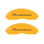 Lot de 4 couvre-étriers, gravés à l'avant : sans boulons/Thunderbird - gravés à l'arrière : sans boulons/emblème Thunderbird, finition avec revêtement en poudre jaune, caractères noirs