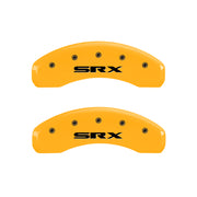 Lot de 4 couvre-étriers, gravés à l'avant : Cursive/Cadillac - gravés à l'arrière : SRX, finition peinture poudre jaune, caractères noirs