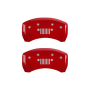 Lot de 4 couvre-étriers, gravés à l'avant : JEEP - gravés à l'arrière : logo de calandre JEEP, finition poudrée jaune, caractères noirs