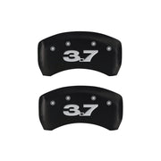 Lot de 4 couvre-étriers, gravés avant : Mustang - gravés arrière : 3,7, finition poudre rouge, caractères argentés.