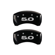 Lot de 4 couvre-étriers, gravés avant : Mustang - gravés arrière : 5.0, finition poudre noire, caractères argentés.