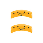 Lot de 4 couvre-étriers, gravés avant : Mustang - gravés arrière : Pony, finition poudre jaune, caractères noirs.