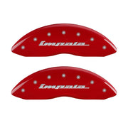 Lot de 4 couvre-étriers, gravés avant et arrière : Impala, finition poudre rouge, caractères argentés.