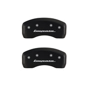 Lot de 4 couvre-étriers, gravés avant et arrière : Impala, finition poudre rouge, caractères argentés.