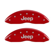 Lot de 4 couvre-étriers, gravés avant et arrière : JEEP, finition poudre rouge, caractères argentés.