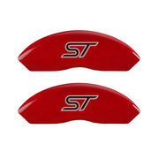 Lot de 4 couvre-étriers, gravés avant et arrière : sans boulons/ST, finition poudre rouge, caractères argentés.
