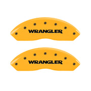 Lot de 4 couvre-étriers, gravés avant et arrière : WRANGLER, finition peinture poudre jaune, caractères noirs