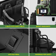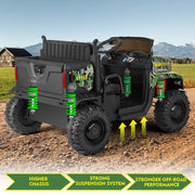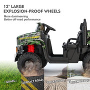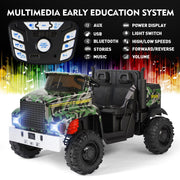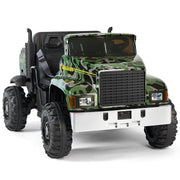 Ride in Style with the 24V Battery-Powered Camo Truck Tractor for Kids, Featuring Bluetooth RC and Trailer The Ride in Style with the 24V Battery-Powered Camo Truck Tractor for Kids, Featuring Bluetooth RC and Trailer is the perfect ride-on toy for adventurous kids. With its camo green color and truck-inspired design, this ride-on toy will make your child feel like they're driving a real truck. Whether they're playing in the backyard or going on an imaginary off-road adventure, this ride-on truck will provide hours of fun and excitement. Key Features: Two-seater ride-on truck with trailer - Perfect for siblings or friends to ride together, this truck features a spacious 18.5'' seat and two separate safety belts. It also comes with a tiltable trailer and a lockable tailgate for storing toys and snacks, adding to the fun and functionality of the ride. Two modes of operation - Kids can operate the electric truck themselves using the pedals and steering wheel, allowing them to enjoy two different speeds. Parents can also take control of the truck using the 2.4GHz remote control, which offers three different speeds. Multiple and joyful functions - This ride-on truck is equipped with a built-in AUX port, USB, TF slot, and Bluetooth, allowing your child to listen to their favorite music while driving. The truck also features high-bright headlights, making nighttime driving even more exciting. Durable and safe design - Made of non-toxic PP and iron, this electric vehicle is built to last. The wheels are equipped with a spring suspension system, making them suitable for various types of roads, including asphalt, brick, and cement. Perfect gift - With a 24V battery and two powerful motors, this ride-on truck offers a thrilling speed range of 4.5-5.5 km/h. It has a large size of 47''x31''x27'' and a loading capacity of 88 lbs, making it the ideal present for your child's birthday or Christmas. Product Specifications: Color: Camo Green Battery: 24V (12V7AH*2) Charger Input: 100-240V, Output: 28.8V 500mA Motor: 200W*2 Charge/Use Time: Charge 14 hours, Use 45-60 minutes Loading Capacity: 88 lbs Speed: 4.5-5.5 km/h Size: 47''x31''x27'' Height Limit: 43.3'' Get ready for an exciting ride with the Ride in Style 24V Battery-Powered Camo Truck Tractor for Kids. With its impressive features and durable design, this ride-on truck is sure to provide endless fun and adventure for your little ones. Order now and let your child experience the thrill of driving their own truck! Package Content: 1 x Electronic Ride On Car 1 x Hardware Bag 1 x Manual Instruction 1 x Remote Control
