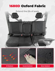 KEMIMOTO seat covers are made of 1680D Oxford fabric, which is water-resistant, dust-resistant, and UV-resistant, extending the life of your seats.If you are traveling with pets, then the covers are also scratch-resistant.