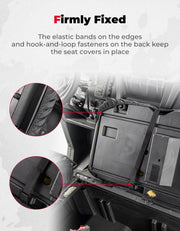 The elastic bands at the edges and the hook-and-loop fasteners at the back keep the seat covers tightly attached to the seat, even during the most challenging off-road conditions, without worrying about them slipping out.