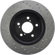 Les disques de frein sport percés StopTech sont des disques de frein monobloc de remplacement direct pour les systèmes de freinage d'usine et les étriers de série qui ont fière allure derrière vos roues et offrent des performances de freinage considérablement améliorées. Le perçage transversal unique facilite la dispersion de la chaleur et de la poussière de frein, empêche le glaçage des plaquettes, ajoute du mordant et améliore les performances de freinage sur sol sec et humide. Conçu pour durer, le revêtement électronique noir offre une protection contre la corrosion et la métallurgie à haute teneur en carbone (dans la plupart des applications) offre un fonctionnement plus silencieux, une meilleure résistance aux fissures et des performances accrues.