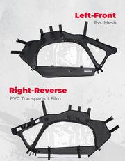 The Kemimoto Can Am Maverick X3 Soft Cab Enclosure provides protection against sun, rain, and dust during summer, and against wind, snow, and cold during winter. The transparent film can be rolled up for ventilation when needed.